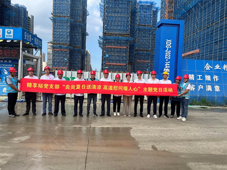 近段时间,连日高温,骄阳似火,酷暑难耐,但是一线的工作者仍然坚守岗位,用他们的汗水确保工地施工的正常进行。7 月 24 日,精享裕党支部全体党员在书记周红星和副书记成砺的带领下,来到华谊路朗诗和华新幼儿园项目部进行慰问。