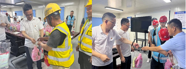 上午 9 时许,一辆满载着夏日温情的车辆缓缓停在了工地门口。此时,这里的施工人员正在热火朝天的奋战。周红星书记向坚守在一线的施工人员表示了衷心的感谢,广大施工人员一直默默无闻,不畏酷暑,夜以继日的奋战着,由于近日持续高温闷热天气,室外作业极易诱发中暑现象,周书记叮嘱他们在注重工程质量进度的同时,要提高高温天里的安全工作意识,做好自我安全保护及防暑降温,做到工作防暑“两不误”。紧接着党员同志们为正在高温酷暑下奋战在一线的施工人员送去水、清凉油、洗衣液等慰问品。